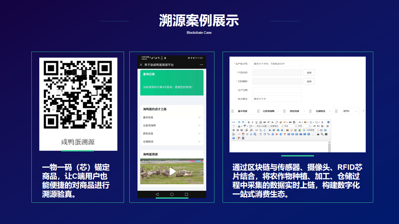 基于一物一码(芯)锚定商品,通过对接第三方系统、PDA或扫码设备,不仅降低了企业客户的管理成本,而且让C端用户也能便捷的对商品进行溯源验真,全面提升了企业的品牌价值。 轻节点与物联网技术结合,从源头确保数据真实;农产品防伪,提升产品附加值;确权为农产品数字化资产交易增信;构建农产品一站式消费生态;
