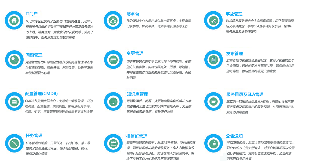 Xsoft.ITSM 是以业务服务为中心,流程为导向,符合ITIL/ISO 20000/ITSS标准的IT运维管理工具平台。以CMDB为基础,建立完整、统一的资源配置管理库,可视化配置CI关联关系、业务影响分析度及资产的完整配置基线管理,实现配置管理与应用的强关联及相互融合并通过整合监控工具达到告警运维一体化,实现整个IT运维体系的落地及规范化,将运维工作化繁为简,标准有序,不断降低运维服务管理工作的风险及成本,为管理者及运维工作人员提供统一的工作及执行平台,最终为企业实现运维四化(标维化、合规化、透明化、系统化)管理。