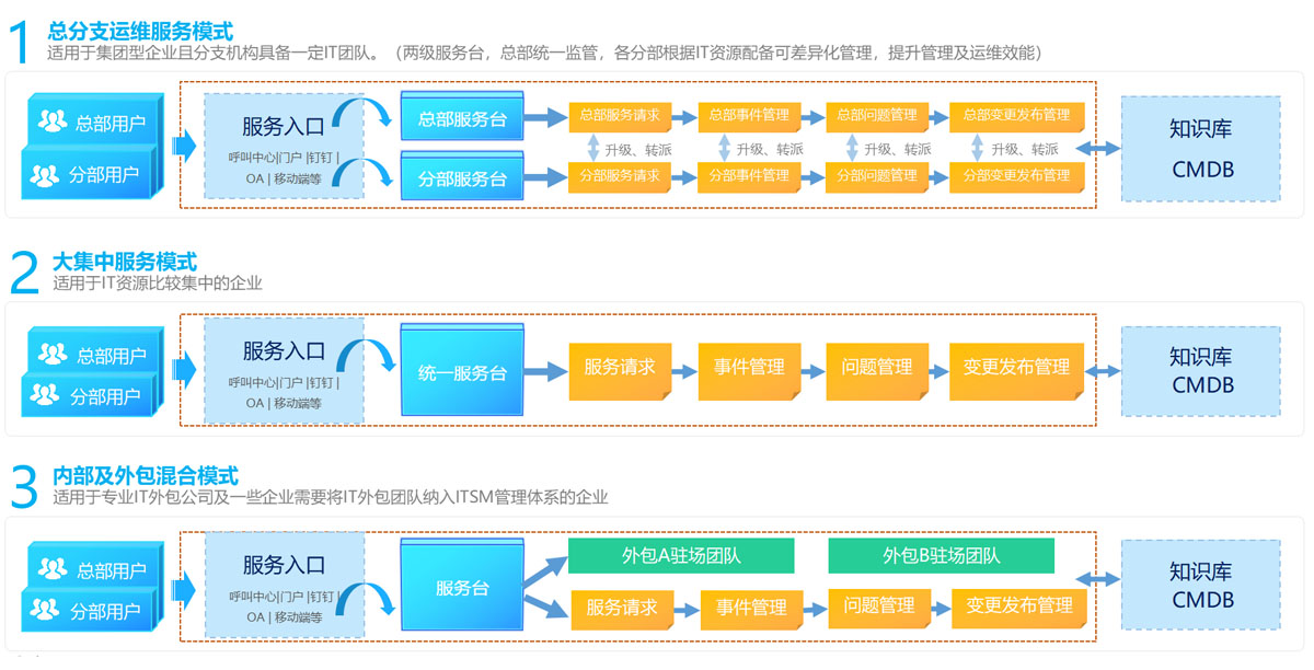 湘软公司根据企业的规模、行业特性以及多年的服务经验积累总结了以下三种运维服务模式:
