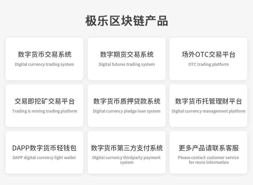 区块链研究中心-全球区块链开发,代币/钱包/游戏/交易综合解决方案,研发顺利完成,系统包括:场内币币交易系统、场外点对点交易系统(OTC/C2C)、合约交易系统、区块链钱包系统、智能合约/代币发现、区块链游戏开发、区块链英勇开发等功能,极乐软件区块链是专业的区块链金融IT解决方案和技术服务供应商,等待您的合作,共创神话!